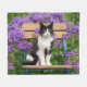 A cute black and white bicolored cat, European Shorthair, sitting on a wooden chair in front of violet garden flowers. Photo taken by Katho Menden. This blanket is a gift idea for cat lovers.