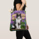 Tuxedo cat sitting on a garden chair with flowers tote bag