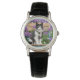 A cute black and white bicolored cat, European Shorthair, sitting on a wooden chair in front of violet garden flowers. Photo taken by Katho Menden. This watch is a gift idea for cat lovers.