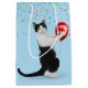 Black and white tuxedo cat holding a red party balloon with colourful confetti on a blue background.