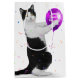 Black and white cat with purple balloon and confetti on white background for Sweet Sixteen birthday.