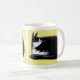 A stylised, colour, cartoon drawing of a tuxedo cat, built up from many hatched fine lines. Cat is curled up, tucked in, it's tail across the base of the drawing. The background on this print variation is yellow.