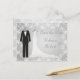 Tuxedo and Gown set against a silver snowflakes background Wedding Save the Date Postcard