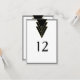 An elegant table number card with simplistic elegance, this design features an art deco inspired geometric pattern of black repeating triangles bordered in gold with simulated gold studs. Enter your table numbers by replacing the sample numbers shown on the front and back of this card. You can add additional text if you wish to include names or other information regarding your event. This card comes in several other sizes to accommodate your needs.