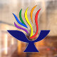 The flaming chalice, the logo of Tennessee Valley Unitarian Universalist Church in Knoxville, Tennessee. Fames are in the colours of the pride rainbow flag ... red, orange, yellow, green, blue, purple - a symbol to represent the Welcoming Church.