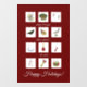 Each individual square of this red grid pattern contains a colourful watercolor representation of each of the twelve days of Christmas with the phrase “my true love gave to me” in white interspersed between the images. From my original digitally created image.