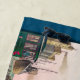 Features people with 20th century transportation: train and railroad station, automobile, trolley, truck, aeroplanes, and ship. There is also a globe in the background.