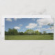 Features photograph of wide angle view of green field and trees.