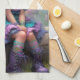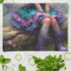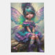 A whimsical fairy girl with sparkling butterfly wings sits gracefully on a mossy log in an enchanted forest. Her ruffled dress blends rich shades of purple, teal, and lilac, matching her streaked hair and glittering wings. The magical atmosphere is filled with glowing flowers and dreamy light, capturing the serene beauty of a twilight forest.