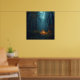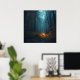 Escape into a tranquil forest at twilight with this atmospheric art print. A glowing campfire flickers in the foreground, casting warm light across a misty woodland path. Tall trees stretch into the fog, blending cool blue tones with fiery orange highlights. Perfect for nature lovers, adventurers, and fans of moody, cinematic landscapes.