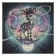 A whimsical horned hybrid stands on a floating crystal platform, dressed in a flowered top hat and skull jewellery. Behind it, skeletal winged horses drift through a swirling cosmic sky filled with stars, bats, and floating gears. A glowing moon face watches from below, adding mischief to this gothic, steampunk dreamscape. AI generated