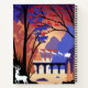 Santa and his reindeer soar across a moonlit bridge surrounded by magical forests and shimmering leaves. A stunning Christmas holiday vibe bathed in deep violet, gold, and sunset orange hues.