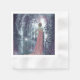 A graceful woman in a flowing, rose-pink gown stands before a mystical, moonlit gate surrounded by ethereal light and enchanted flora. Her back is turned, as if she's about to step into a magical realm beyond the ornate archway. The scene blends elegance with fantasy, inviting the viewer to imagine the secrets that lie on the other side.