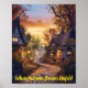 As the day transitions into twilight, this storybook village comes alive with a serene charm. The cobblestone path winds through quaint cottages, their thatched roofs and illuminated windows casting a cosy glow. Lanterns hanging from branches and doorways add a magical touch, guiding your steps through this enchanting autumn scene. Vibrant fall foliage frames the village, enhancing the picturesque beauty of the setting sun casting hues of pink and gold across the sky.