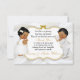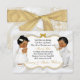 Beautiful twin baby girl & boy in their christening dress and gold cross necklace. Invitation background is white satin with a gold and silver glitter frame and bow embellishment. Back is adorned with gold flower pattern & gold ribbon on a white satin background.