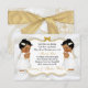 Beautiful twin baby girls in their christening dress and gold cross necklace. Invitation background is white satin with a gold and silver glitter frame and bow embellishment. Back is adorned with gold flower pattern & gold ribbon on a white satin background.