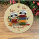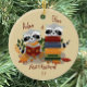 A first cute Christmas ornament for your twin babies featuring two little raccoons on the front and a leaf pattern on the back . Personalise this keepsake with your children's name and the year .