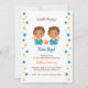 Cute cartoon baby boys in matching blue rompers and yellow bibs holding baby rattles. Lovely and original baby shower invitation.