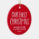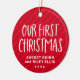 Celebrate and commemorate your twins' first Christmas with this sweet and simple keepsake photo ornament. Featuring "our first Christmas" in playful type on a festive holiday red stripe background, this cute ornament also has room for custom text for the names and year and also a photo on the reverse side. This first Christmas ornament makes a great gift for new parents or can be bought for your own family!