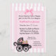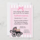 Twins Baby Shower invitations for girls A Pink stripe background with twin babies sitting in a baby stroller Use our easy template to customise your baby shower invitations with your party details.
