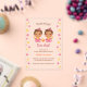 Cute cartoon baby girls in matching pink rompers and yellow bibs holding baby rattles. Lovely and original baby shower invitation.