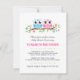 Cute baby shower invitation for mothers expecting a twin boy and girl featuring two cartoon owls, one pink and one blue, sitting on a branch with green leaves and hot pink and blue flowers. The back of the invite is green. Black and pink, customisable invite text. Available on different paper types. For custom requests or help with customisation please use the store contact link.
