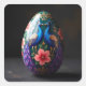 A detailed, close-up shot of an ornate, emerald green Easter egg. Two vibrant blue peacocks with gold accents are depicted facing each other, their heads nearly touching. Their elaborate tails, a gradient of purple and blue feathers, fan out around them. The egg is further adorned with delicate pink flowers, green leaves, and intricate gold filigree patterns.