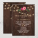 Rustic country style housewarming bbq / party stylish invitation template on dark brown barn wood featuring a blush fuchsia pink flowers bouquet, string of lights and three doodle hearts on the back. Fill in your information in the spots, You can choose to customise it further changing fonts and colours of lettering. ---- The invitation is suitable for outdoor garden / backyard rustic country housewarming parties. --- If you need assistance, please contact me!