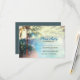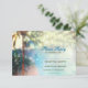 beautiful ombre blue coral beach wedding or destination wedding RSVP card with string of lights hanging on the palm trees.