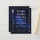 A celestial baby shower invitation with stars and moon on the left and right borders and a starry night as a background. The text is light grey and white. The title "Twinkle Twinkle Little Star" and the name are written in a golden handwriting script, with little stars on the i in the words "Twinkle". On the back, there is only the starry night background.