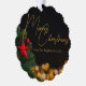This gorgeous Merry Christmas ornament card features modern gold script over twinkling lights next to a festive Christmas tree that is decorated with red and green ornaments. Customise these elegant holiday ornaments for your friends and family with custom text in the black night sky.