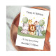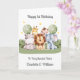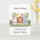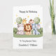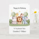 This 1st birthday card is suitable for twins or a single child. The design includes the number 1, two green birthday balloons, and five watercolour safari animals - hippo, giraffe, lion, monkey and elephant.