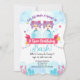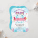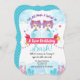 Mermaid twin birthday invitation in teal, purple and coral pink with a pair of cute twin mermaid girls sitting on bubbles. Text reads "Let's all make a splash at a twin birthday bash!" Perfect for a mermaid twin themed birthday party or swim party.