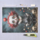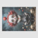 A gothic circus-themed design featuring a haunting clown doll with piercing golden eyes, surrounded by eerie skulls and surreal details. Perfect for creating dramatic, darkly whimsical decoupage art that captures attention."