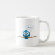 This blue twitter bird cartoon is sitting on a rope. He is tweeting.