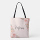 The design on the back of the tote features a peach background, with peach flowers in the upper right corner and lower left corner. The text reads, "Mum."