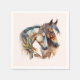 Paper napkins with an image featuring a pair of horses. Wearing decorative headbands. Surrounded by feathers and foliage.