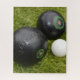 Pictured on green grass are two black Lawn Bowls and a kitty