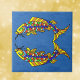 This decorative ceramic tile has a deep blue background with two brightly coloured abstract fancy fish with scales in yellow, orange, and blue.