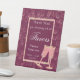 An elegant pedestal sign for Wedding featuring two rose Champagne glasses with rose gold and gold glitter. A frame matching the glasses design and a burgundy background.