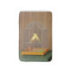 This design features a painting by the Italian artist Antonio Donghi (1897–1963). It shows two yellow canary birds sitting on a wooden perch in their metal cage. The birds are facing in opposite directions from each other, so one bird's tail is next to the other bird's head. There appears to be a piece of lettuce or some other greenery at the bottom of the cage. The cage is resting on a table, which is covered by a green tablecloth. The table is up against the wall, which is decorated in orangey brown wallpaper. The yellow birds seem relaxed and contented in their cage.