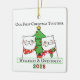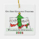 Two white cats wink at each other with red and white polka dot bandanas with a Christmas tree behind them. Our First Christmas Together is above the cats, with personalized names under them and the year, which is an outline with red and green numbers placed outside the outline. So cute! On the back, there is a Christmas tree with a heart on top and a small text box for leaving a sweet note. This design is ideal for cat lovers and cat owners who are spending their first Christmas together as a couple.