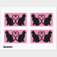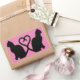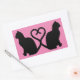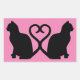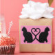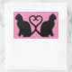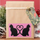 A black and white silhouette of two cats. Their identically curled tails come together to form a heart.