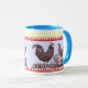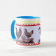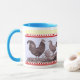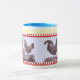Unique Mug featuring an antique image of a chicken and a rooster. Text can be added to the yellow band at the top if desired.
