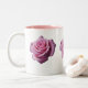 A white two-tone cup with a pink interior and a beautiful pink rose design on it, intended for drinking coffee and hot tea