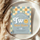 This groovy boys 2nd birthday welcome sign captures retro 70s vibes with a cute blue theme, and a pastel chequered pattern. It includes space to add your boys name in a fun script. Perfect for a "Two Cool Dude" boho birthday.