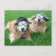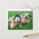 This postcard features a photograph of two smiling golden retriever dogs laying in green grass. They're wearing baseball caps and black nerd sunglasses and looking cool!