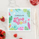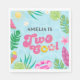 This tropical summer pool birthday party paper napkins features tropical leaves, tropical flowers,pool tire, sun glasses, ice cream and a flip flop sandal, A Perfect summer pool 2nd birthday two cool theme photo birthday table decor.