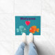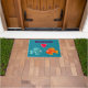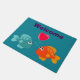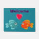 Two cute cartoon fish facing each other, blowing bubbles to form a big red love heart shape bubble over their heads. On the left is a blue fish and on the right is an orange fish. All on a blue background that can be customised to any colour.