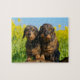 Two adorable wild boar coloured wire haired dachshund dogs side by side in front of yellow flowering rape blossoms. A cute funny doggy photo taken by Katho Menden. This pet photo puzzle game is a gift idea for dog lovers. http://www.zazzle.com/kathom_photo
